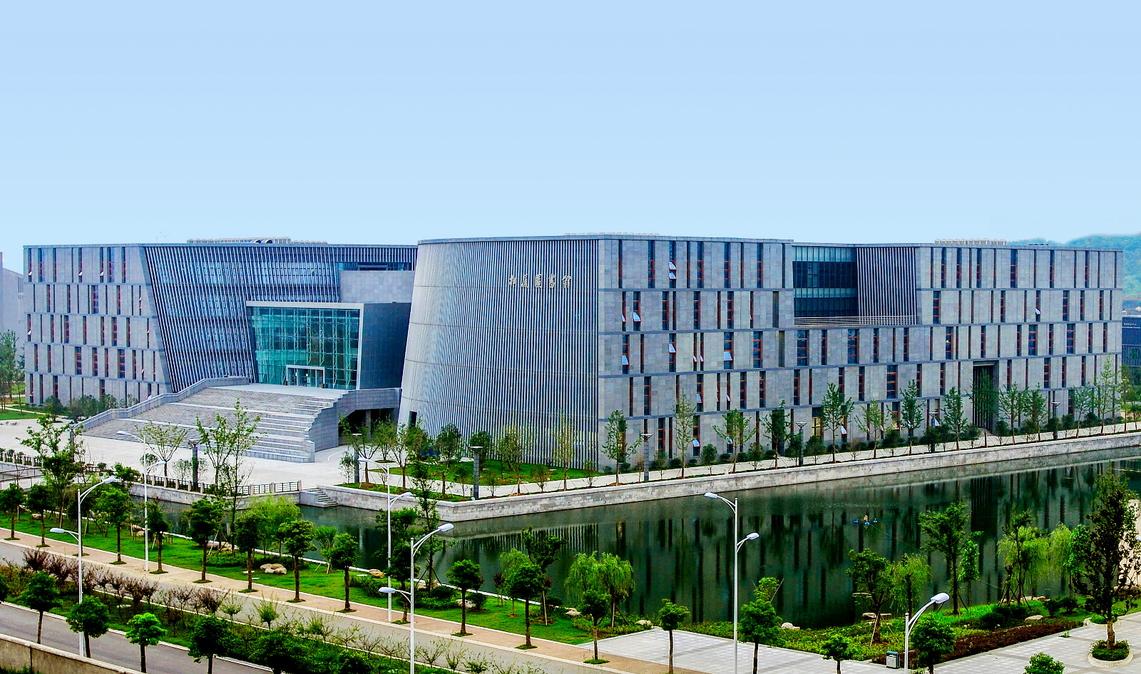 圖書(shū)館外部造型獨特,風(fēng)格莊重典雅,整體造型是一本打開(kāi)的書(shū),周?chē)h(huán)繞著(zhù)河流,寓意“書(shū)山有路勤為徑,學(xué)海無(wú)涯苦作舟”; 建筑共分五層,以閱覽空間和書(shū)庫為主,整體布局緊湊合理:一層為辦公區、報告廳、展廳、密集書(shū)庫、教室;二層為期刊閱覽服務(wù)區、工具書(shū)閱覽區、信息共享大 廳;三層為圖書(shū)閱覽服務(wù)區;四層分為民國資料、港臺資料、古籍資料閱覽區;五層為行政辦公區、電子閱覽室、音樂(lè )鑒賞室、名人贈閱區。